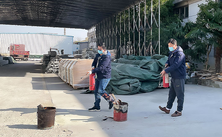 在應(yīng)急集合點,大家認真聆聽滅火器正確使用方法,并現(xiàn)場體驗了如何使用干粉滅火器撲滅火源。